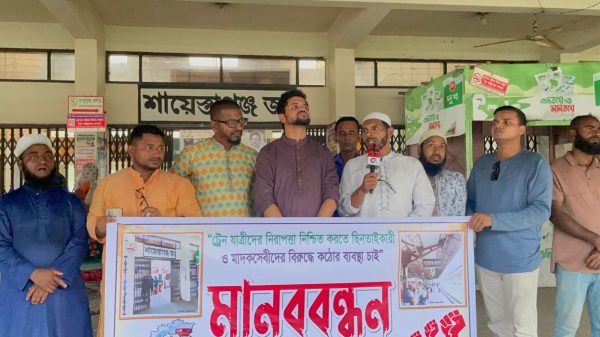 হবিগঞ্জের শায়েস্তাগঞ্জ রেলওয়ে জংশনে ট্রেন যাত্রীদের নিরাপত্তা নিশ্চিত করা এবং ছিনতাইকারী ও মাদকসেবীদের বিরুদ্ধে কঠোর ব্যবস্থা গ্রহণের দাবিতে মানববন্ধন অনুষ্ঠিত হয়েছে। শুক্রবার আসরের নামাজের পর স্টেশন প্রাঙ্গণে “সচেতন শায়েস্তাগঞ্জবাসী”-এর আয়োজনে read more